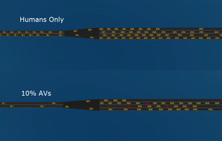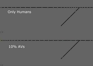 那么AV究竟是如何缓解拥堵的呢?下面的动图展示了一种可能的机制,它比较了在主干道匝道入口完全人类驾驶的情形(上半部)和每十辆车中有一辆是自动驾驶(红色)而其它九辆是人类驾驶(白色)的情形。在这两种情形下,人类驾驶员都想尽快冲入主道,而几乎不关心主道上的车辆。