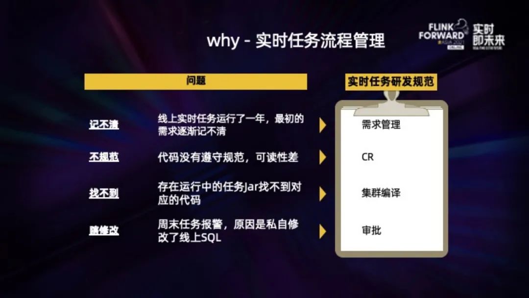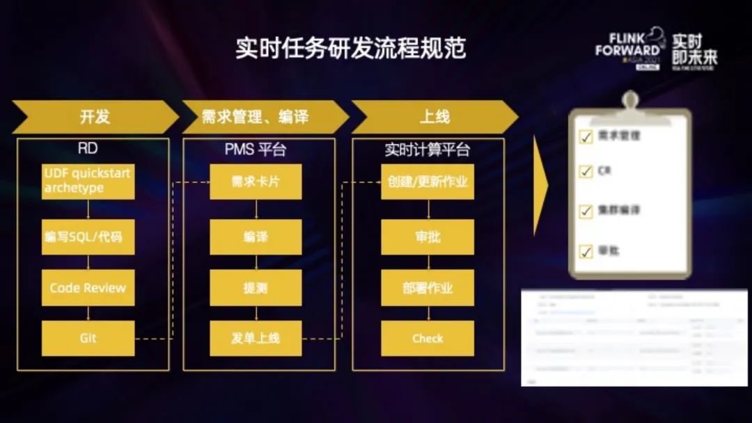 整个研发流程,是不能从线下私自修改的,比如更换 jar 包或者生效到哪个任务上。一个实时任务,即使运行上几年,也能够从当前任务找到谁上的线、谁审批的,当时的测试记录、对应 Git 代码,以及最最开始谁提出来的实时指标的需求,这样才能将任务长久的维护起来。