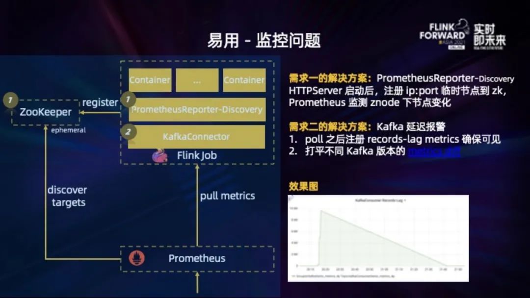 KafkaConsumer.records-lag 是比较实用、重要的延迟指标,主要做了两个工作。修改 KafkaConnector,在 KafkaConsumer.poll 之后再 expose 出来,确保 records-lag 指标可见。另外在做这个的过程中,发现不同 Kafka 版本的这个指标格式不同 (https://cwiki.apache.org/confluence/pages/viewpage.action?pageId=74686649),我们的做法是都打平为一种格式,注册到 flink 的 metrics 里。这样不同版本暴露出来的指标是一致的。