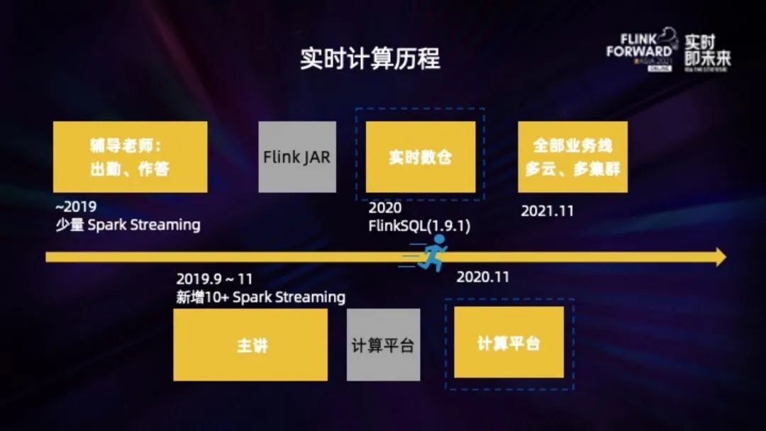 上一个阶段主要是在应用 Flink SQL 支持快速开发实时作业,以及搭建了实时计算平台,支持了上千条的 Flink 作业。