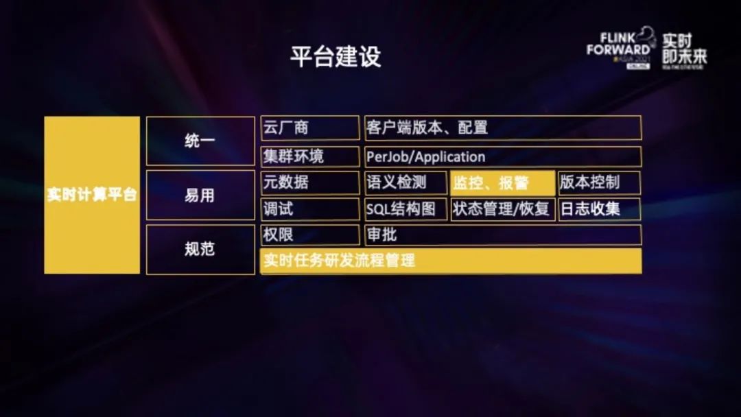 规范:权限控制、流程审批等,类似于在线服务的上线流程,通过平台,能够把实时任务的研发流程规范起来。