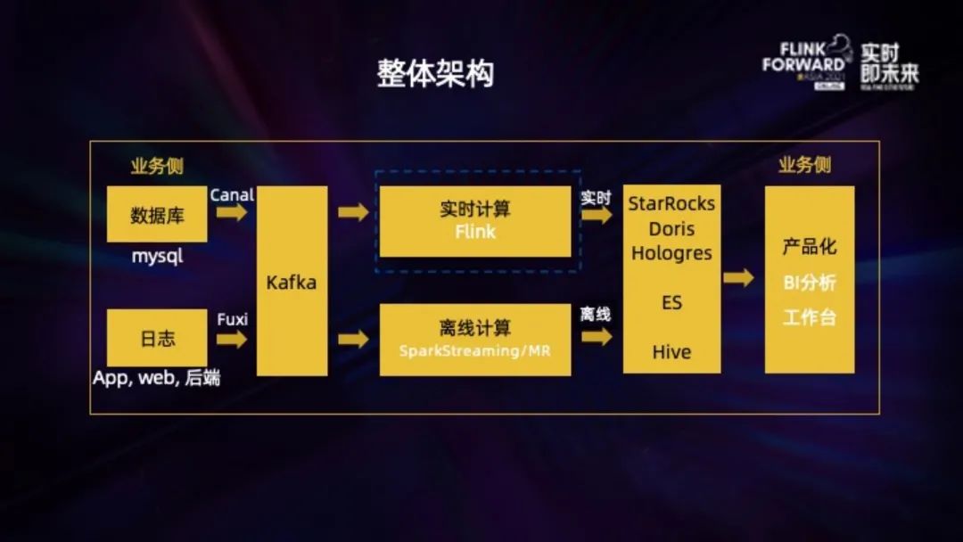 作业帮主要运用人工智能、大数据等技术,为学生提供更高效的学习解决方案。因此业务上的数据,主要是学生的到课情况、知识点掌握的情况这些。整体架构上,无论是 binlog 还是普通日志,经过采集后写入 Kafka,分别由实时和离线计算写入存储层,基于 OLAP 再对外提供对应的产品化服务,比如工作台、BI 分析工具。