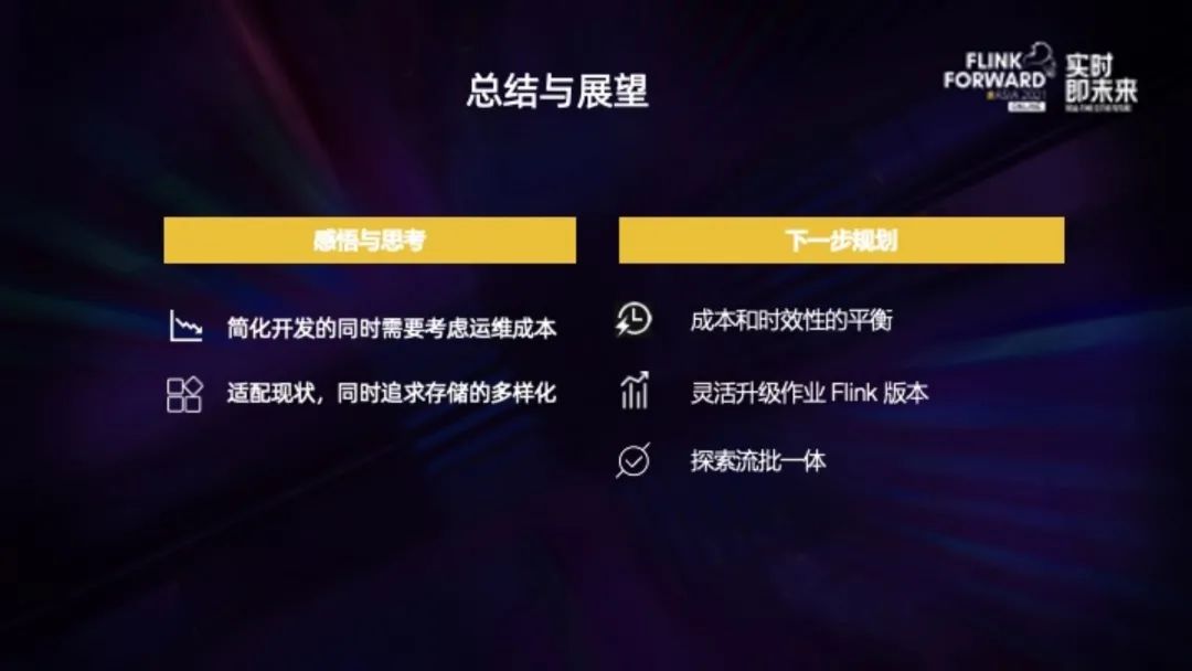 另外一个就是适配现状,先能尽快满足当前需求,比如我们就是提高人效、降低开发门槛。同时也要不断探索更多业务场景,比如使用 HBase、RPC 服务替换 Redis Connector,现在的好处是修改底层存储,用户 SQL 作业感知很小,因为 SQL 作业里基本都是业务逻辑,而 DDL 定义到了元数据。