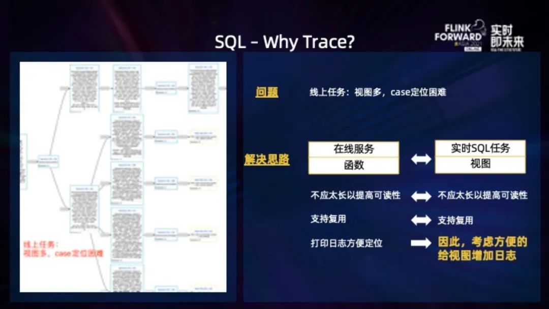 下图左边是一个示例任务的部分 DAG,可以看到 SQL 节点很多。这种情况下出了 case 定位比较困难,因为如果是 DataStream API 实现的代码,还可以添加日志。但是 SQL 做不到,用户能够干预的入口很少,只能看到整个作业的输入输出。