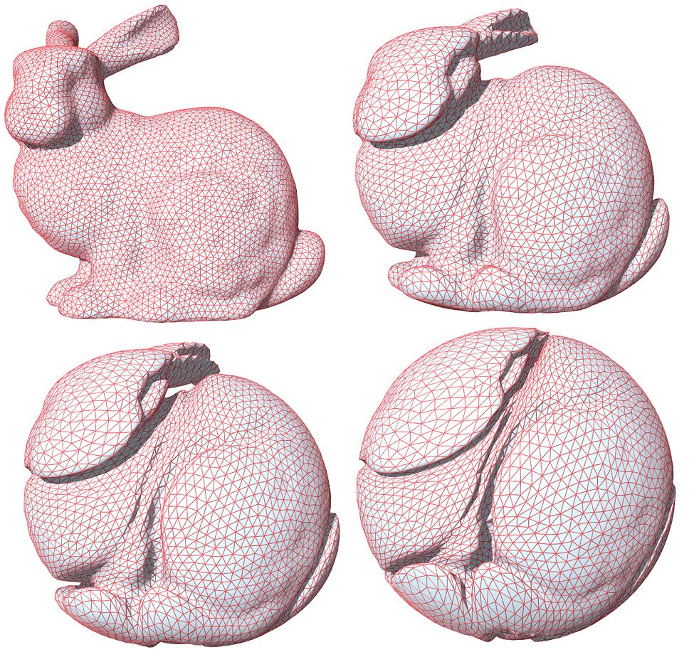 图6. 实心兔子和实心球之间的最优传输映射,表面皱褶结构,(苏科华作)。