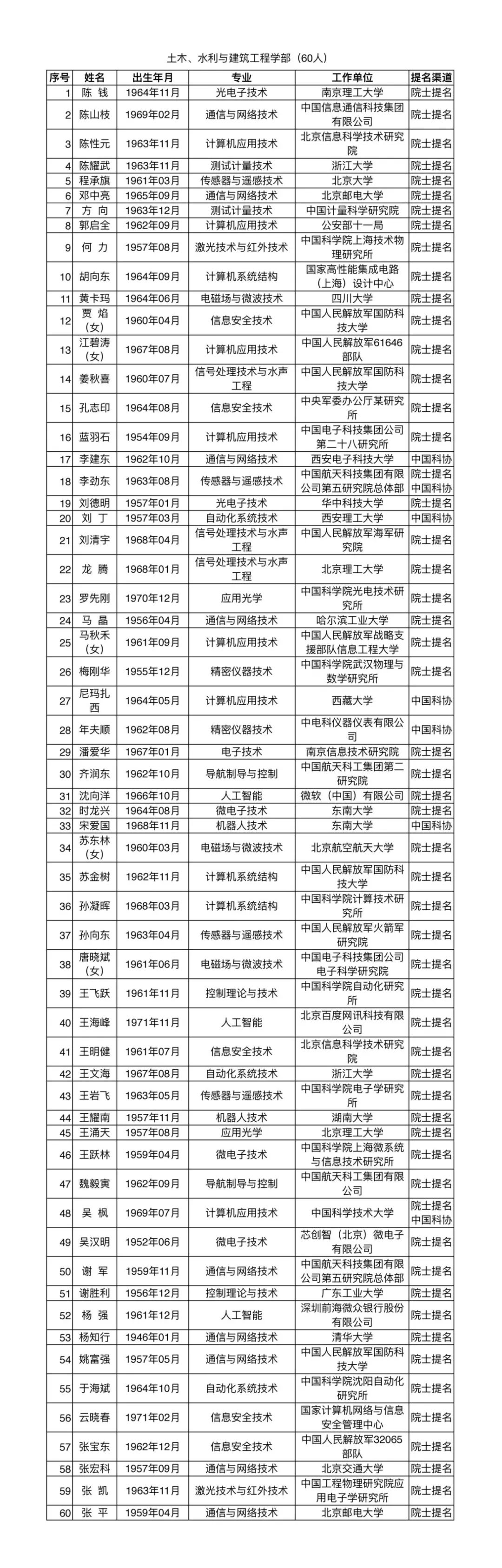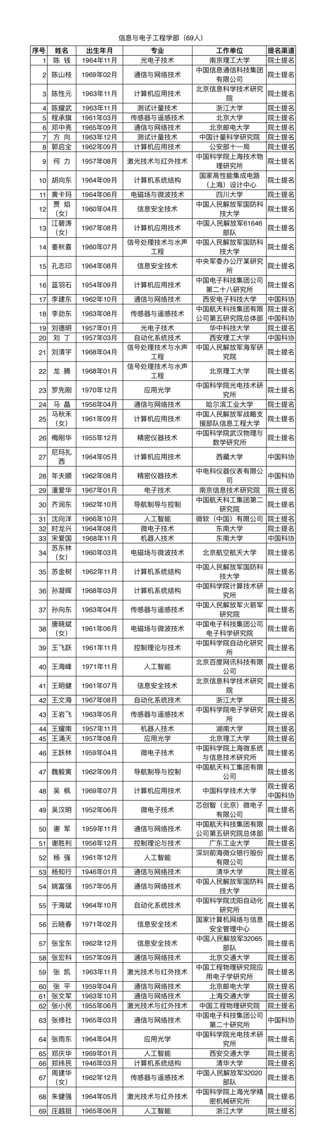 其中,名单中信息与电子工程学部共增选69名候选人,专业领域为“人工智能”的有微软(中国)有限公司沈向洋、北京百度网讯科技有限公司王海峰、深圳前海微众银行股份有限公司杨强、西安交通大学郑庆华、浙江大学庄越挺5人。
