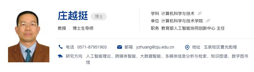 根据浙江大学官网,庄越挺是浙江大学计算机学院教授,国家杰出青年科学基金获得者(2005年)、“百千万人才工程”国家级人选者(2006年)、教育部长江学者特聘教授(2008年)、浙江省特级专家(2014年)、973首席科学家(2011年)、享受国家政府特殊津贴(2000年)、浙江省有突出贡献中青年专家(2013年)、浙江省“151人才工程”第一层次培养人员(2000年),教育部“网络多媒体智能信息处理技术”创新团队带头人。国务院学位委员会第七届学科评议组成员。中国人工智能学会(CAAI)会士(2018)、常务理事。浙江省计算机学会理事长。中国计算机学会(CCF)2018中国计算机大会(CNCC 2018)程序委员会主席。