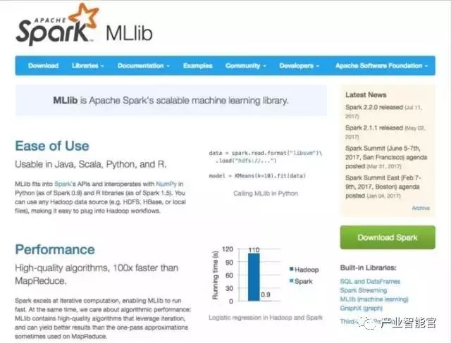 早期版本的 Spark 增强了对 MLib 的支持,MLib 是主要面向数学和统计用户的平台,它允许 通过持久化管道特性将 Spark 机器学习工作挂起和恢复。2016 年发布的 Spark2.0,对 Tungsten 高速内存管理系统和新的 DataFrames 流媒体API 进行了改进,这两点都会提升机器学习应用的性能。