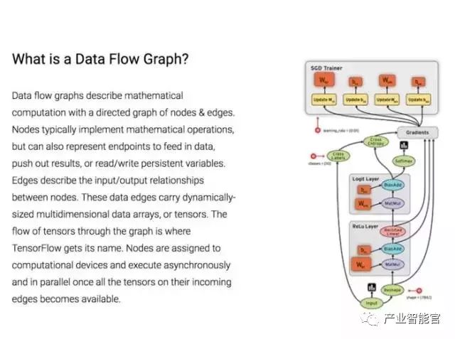 TensorFlow 实现了所谓的数据流图,其中的批量数据(“tensors”)可以通过图描述的一系列算法进行处理。系统中数据的移动称为“流”-其名也因此得来。这些图可以通过 C++ 或者 Python 实现并且可以在 CPU 和 GPU 上进行处理。