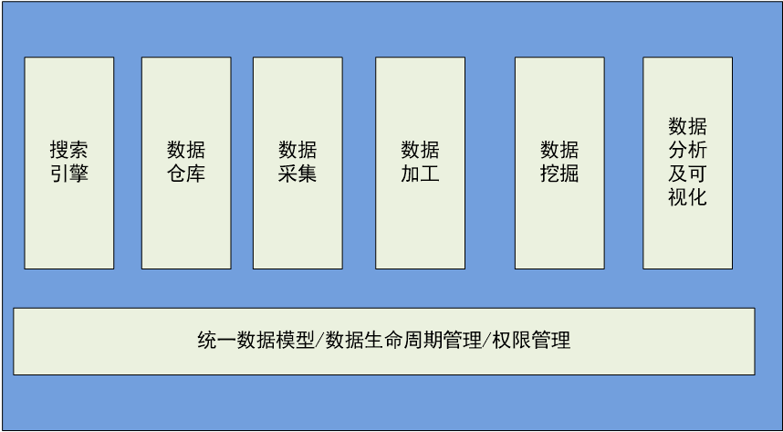 搭建一款集数据采集、存储、搜索、加工、分析为一体的大数据平台,融合结构化数据、非结构化数据,实现了统一数据架构,对海量异构数据的存储归档、信息组织、搜索访问、安全控制、分析可视化,以及数据挖掘、数据治理等,如图1所示。