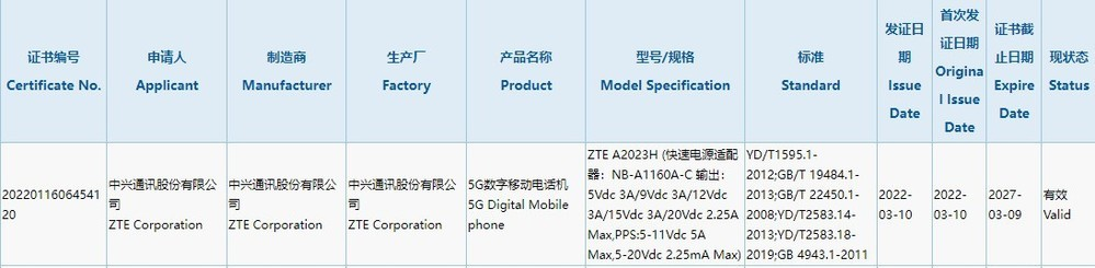 中兴一款 5G 新机今日通过了国家 3C 质量认证,型号为 ZTE A2023H,而且标配 NB-A1160A-C 充电器,最高支持 55W 快充。不过,目前还无法确认该机属于哪个品牌或哪个系列,但该机之前也已通过 WiFi 认证。据悉,中兴上一次发布的新机是努比亚 Z40 Pro,搭载骁龙 8 Gen 1 处理器,配有 UFS3.1、LPDDR5 存储规格。另外,该机还搭载双扬声器,支持 Snapdragon Sound,以及 DTS 音效。