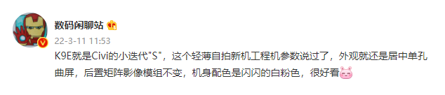据 @数码闲聊站 今日透露:“K9E 就是 Civi 的小迭代"S",这个轻薄自拍新机工程机参数说过了,外观就还是居中单孔曲屏,后置矩阵影像模组不变,机身配色是闪闪的白粉色,很好看”。从目前的爆料信息来看,这款全新版本的 Civi 属于是小修补的半迭代产品,整体外观配置基本维持前代设计,正面是超窄边框的双曲面居中开孔屏幕,背部为阶梯式的三摄方案。预计这款新 Civi 在售价上也将基本维持前代的两千元档。