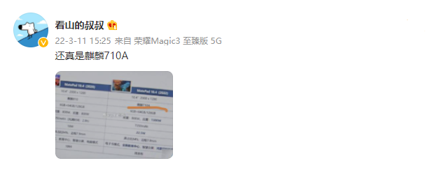 据华为经销商 / 数码博主 @看山的叔叔 今日爆料, MatePad 10.4 2022 国行平板将搭载麒麟 710A 处理器。据悉,麒麟 710A 由中芯国际代工制造,采用 14nm 制程工艺,主频 2.0GHz,属于麒麟 710 的降频版。此外,从曝光的配置图来看,MatePad 10.4 2022 屏幕分辨率为 2000*1200,搭载麒麟 710A 处理器,6GB 内存,可选 64GB 和 128GB 闪存,搭载 7250mAh 电池,支持 22.5W 充电。