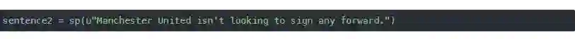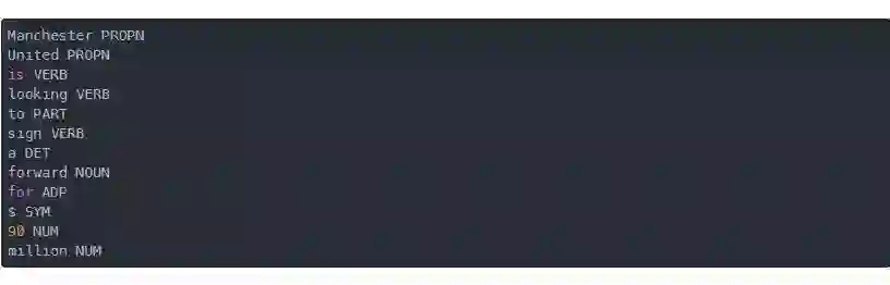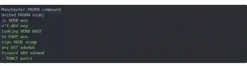 你可以看到,我们句子中的每个单词或标记都被指定了一个词性。例如,“Manchester”被标记为专有名词,“Looking”被标记为动词,等等。