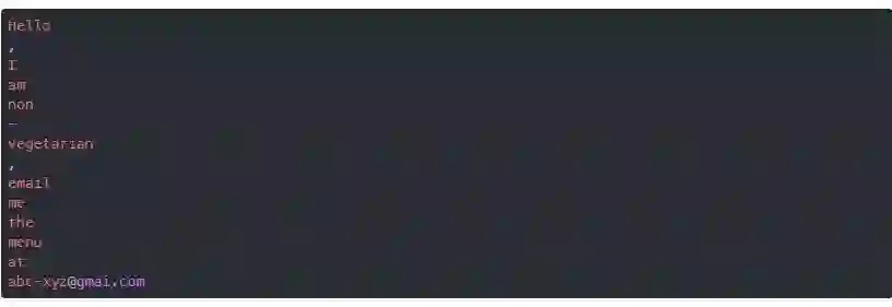 从输出结果可以明显看出,spaCy实际上能够检测到这个电子邮件,尽管它有一个“-”,但并没有对其进行标记。另一方面,“non-vegetarian”一词被标记出来。