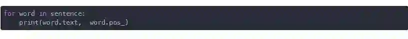 可以看到我们的文档中有以下标记。我们还可以使用下面所示的.pos_属性来查看每个标记的词性: