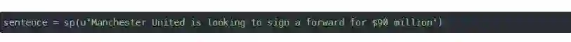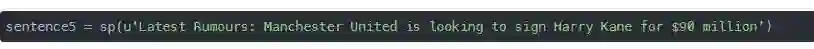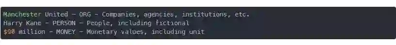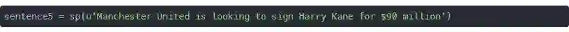 输出:你可以看到spaCy的命名实体识别器已经成功地将“Manchester United”作为一个组织,“Harry Kane”作为一个人,“$90 million”作为货币值识别出。