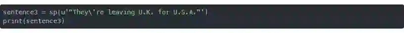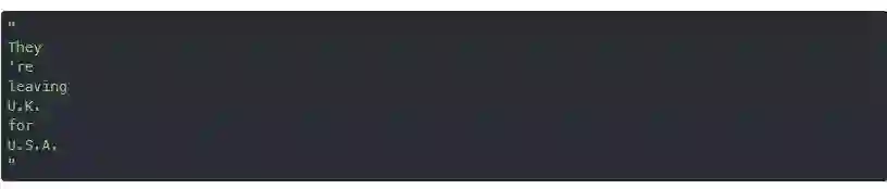 我们来详细看看spaCy标记化。使用以下脚本创建一个新文档:你可以看到这个句子的开头和结尾都有引号。缩写 "U.K" 和 "U.S.A."中还包含标点符号。