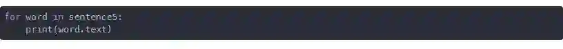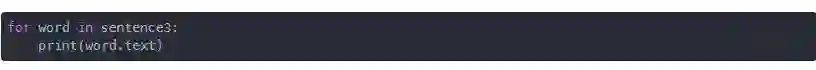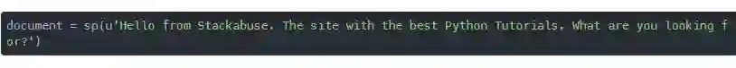 现在我们使用这个模块来创建一个小文档。文档可以是一个句子,也可以是一组句子,长度不限。下面的脚本创建一个简单的spaCy文档。当使用该模块创建文档时,SpaCy会自动将文档分解为一系列标记。