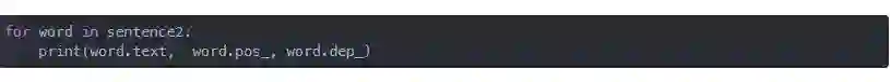 从输出中,你可以看到spaCy足够智能,可以找到标记之间的依赖关系,例如在我们的句子中有一个单词is"nt。依赖项解析器将其分解为两个单词,并说明n"t实际上是对前一个单词的否定。
