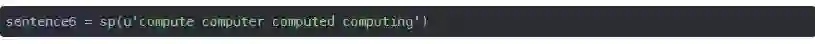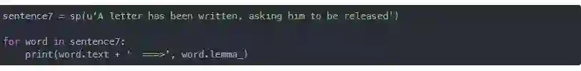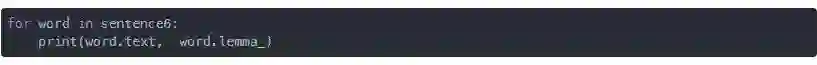 为此,我们需要使用spaCy文档中的lemma_属性。假设我们有下面这句话:我们可以通过下面的代码使用spaCy词形还原找到所有单词的词根: