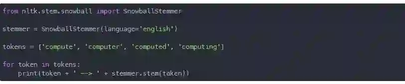 Snowball stemmer是Porter stemmer的一个稍微改进版本,通常比后者更受欢迎。我们来实例看看:在上面的脚本中,我们使用Snowball stemmer来查找与porter stemmer实例中相同的4个单词的词干。输出如下: