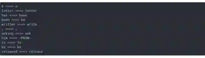 从输出中可以清楚地看到,“written”、“released”等第二、三种形式的单词已被转换为第一种形式,即:“write”和“release”。