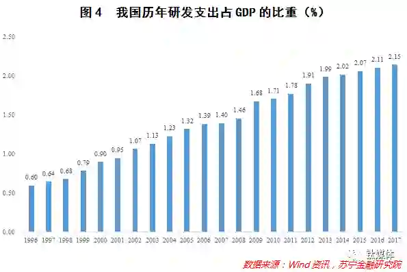 以研发经费为例,虽说近些年我国研发支出占GDP的比重实现了显著增加,由1996年的0.6%上升至2017年的2.15%(参见图4),但同日本长期高于3%(最高时为2008年的3.46%)的水平相比仍有相当大的差距。