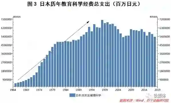 日本科技创新的突飞猛进,离不开对科技人才的大力培养。日本现代化教育始于明治维新,而后对于教育制度的不断改进,使日本的教育实现了民主化、个性化、法制化。同时,日本政府对教育经费的投入力度也在持续加码。Wind数据显示,1965年日本国民教育科学经费总支出为4957.5亿日元,到了1998年,该数值增至71246.07亿日元,年均增速超过8%(参见图3)。