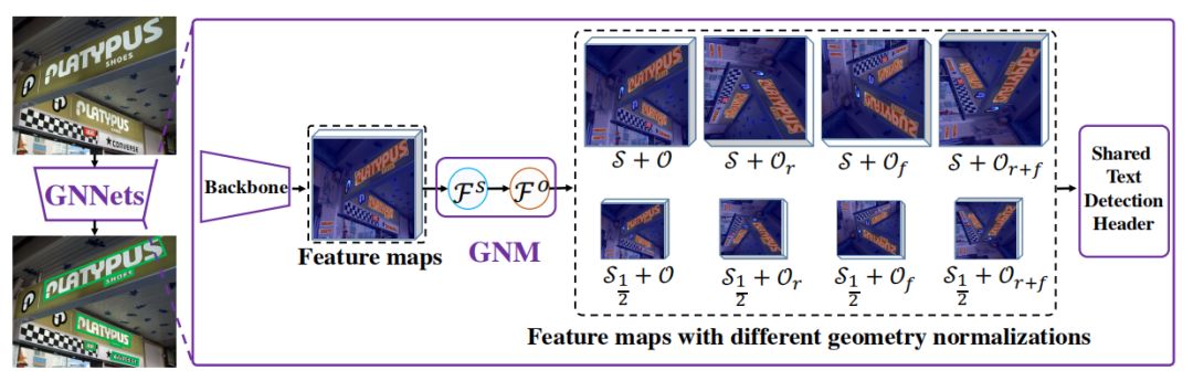 Fig. 1是GNNets的整体网络结构图。总体网络结构由Backbone,GNM,SharedText Detection Header组成。通过Backbone提取的特征图会被输入到具有多个分支的几何规范化模块(GNM)中,每个分支由一个尺度归一化单元(SNU)Fs和方向归一化单元(ONU)Fo组成。SNU有两个不同比例的尺归一化单位(S,S1/2)和四个方向归一化单位(O,Or,Of,Or + f)。通过SNU和ONU的不同组合,GNM会生成不同的几何归一化特征图,这些特征图将被输入到一个共享文本检测标头中。
