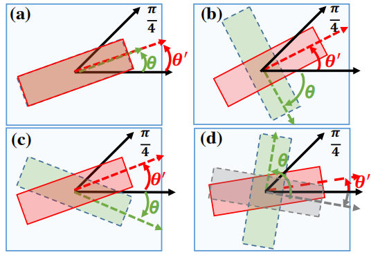 Fig.2是作者提出的ONU模块的示意图。通过应用ONU可以更改文本框方向。如图所示“绿色”框是原始框,“灰色”框是转换过程中的中间框,“红色”框是ONU的输出的结果框。θ和θ’分别是原始框和结果框的角度。(a),(b),(c)和(d)分别是O,Or,Of,Or + f的过程的示意图。由上图可以简单明了的表示ONU具有将[0,π/4],[-π/2,-π/4],[-π/4,0]和[π/4,π/2]角度的文本转换为在[0,π/4]角度的文本。