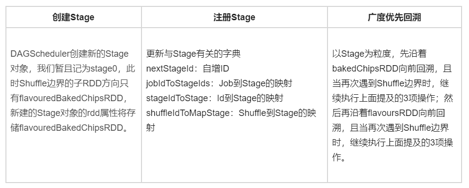 在回溯完毕时,DAGScheduler 同样会重复上述 3 个步骤,根据 DAGScheduler 以 Shuffle 为边界划分 Stage 的原则,沿途的所有 RDD 都划归为同一个 Stage,暂且记为 stage1。值得一提的是,Stage 对象的 rdd 属性对应的数据类型是 RDD[],而不是 List[RDD[]]。对于一个逻辑上包含多个 RDD 的 Stage 来说,其 rdd 属性存储的是路径末尾的 RDD 节点,具体到我们的案例中就是 bakedChipsRDD。