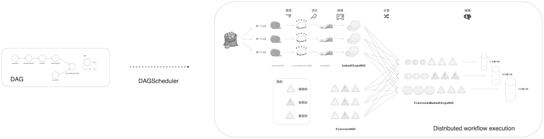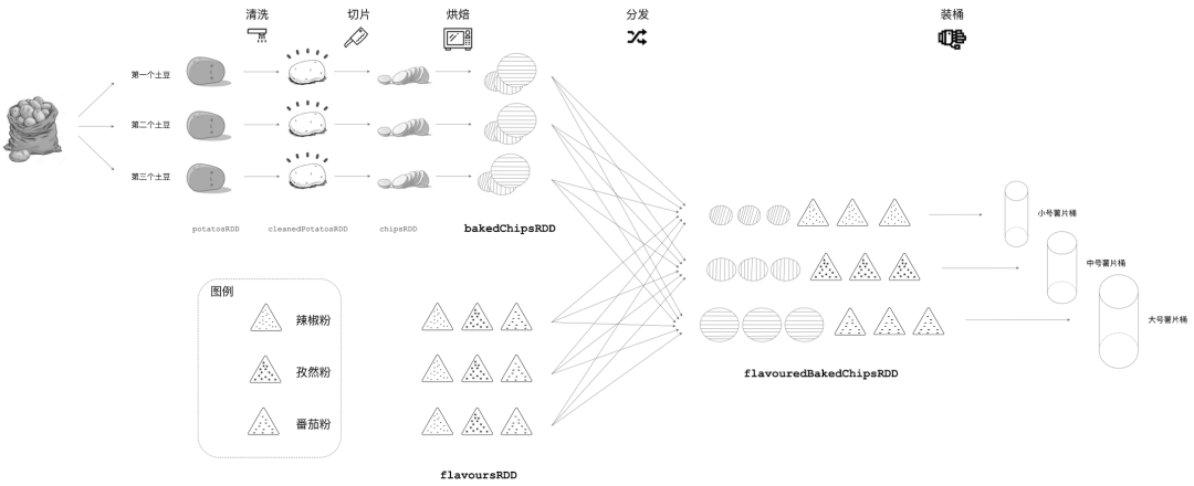 不过,工业应用中的 Spark DAG 要比这复杂得多,往往是由不同 RDD 经过关联、拆分产生多个分支的有向无环图。为了说明这一点,我们还是拿土豆工坊来举例,在将“原味”薯片推向市场一段时间后,工坊老板发现季度销量直线下滑,老板心急如焚、一筹莫展。此时有人向他建议:“何不推出更多风味的薯片,来迎合大众的多样化选择”,于是老板一声令下,工人们对流水线做了如下改动。