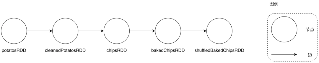 在上面的土豆加工 DAG 中,每个节点是一个个 RDD,每条边代表着不同 RDD 之间的父子关系 —— 父子关系自然是单向的,因此整张图是有指向性的。另外我们注意到,整个图中是不存在环结构的。像这样的土豆加工流水线可以说是最简单的有向无环图,每个节点的入度(Indegree,指向自己的边)与出度(Outdegree,从自己出发的边)都是 1,整个图看下来只有一条分支。