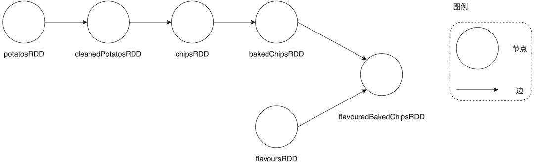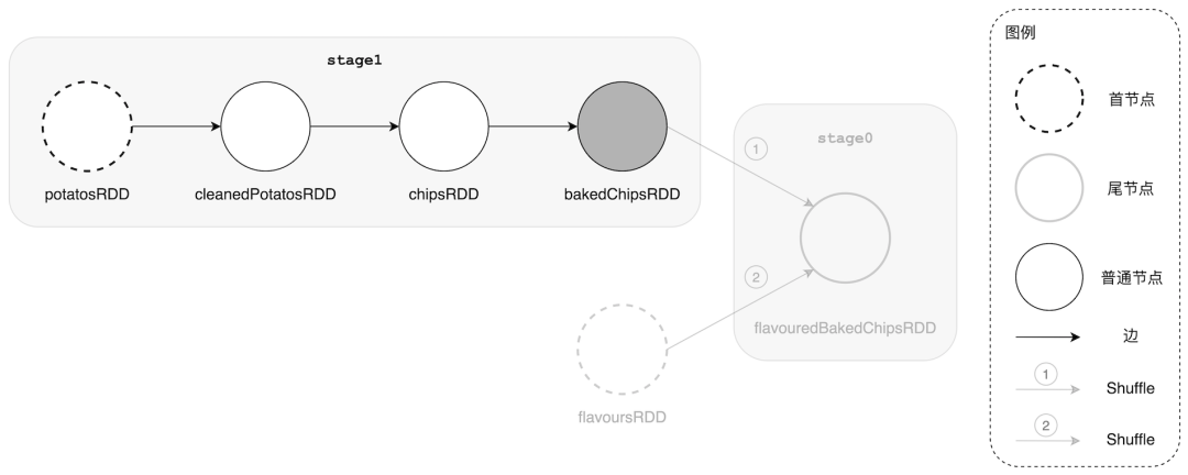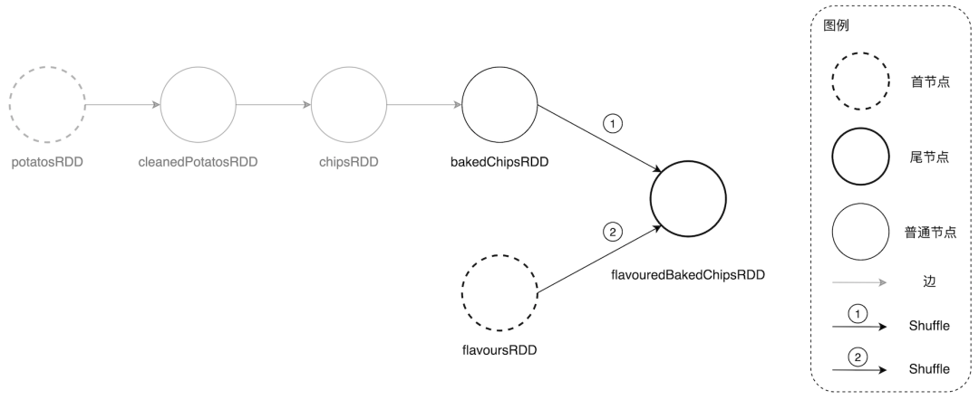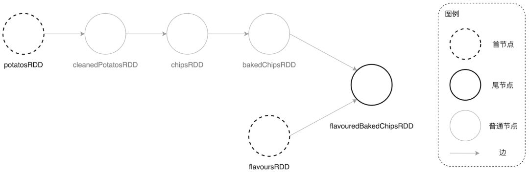 为了回答这些问题,我们需要先对于 DAG 的“首”和“尾”进行如下定义:在一个 DAG 中,没有父 RDD 的节点称为首节点,而没有子 RDD 的节点称为尾节点。还是以土豆工坊为例,其中首节点有两个,分别是 potatosRDD 和 flavoursRDD,而尾节点是 flavouredBakedChipsRDD。