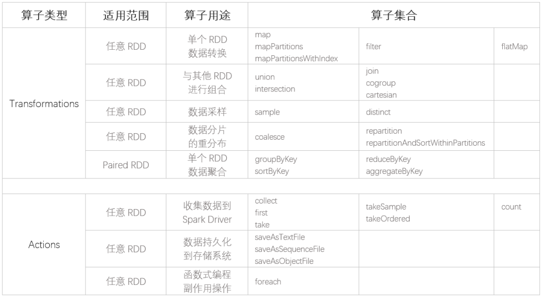还是说回 RDD 算子,除了常见的按照 Transformations 和 Actions 分类的方法,笔者又从适用范围和用途两个维度为老铁们做了归类,毕竟人类的大脑喜欢结构化的知识,官网上一字长蛇阵的罗列总是让人看了昏昏欲睡。有了这个表格,我们就知道 *ByKey 的操作一定是作用在 Paired RDD 上的,所谓 Paired RDD 是指 Schema 明确区分(Key, Value)对的 RDD,与之相对,任意 RDD 指的是不带 Schema 或带任意 Schema 的 RDD。从用途的角度来区分 RDD 算子的归类相对比较分散,篇幅的原因,这里就不一一展开介绍,老铁们各取所需吧。