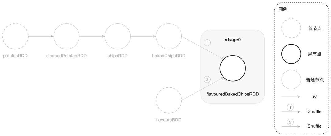 DAGScheduler 在尝试探索 DAG“地形”时,是以首尾倒置的方式从后向前进行。具体说来,对于土豆工坊的 DAG,DAGScheduler 会从尾节点 flavouredBakedChipsRDD 开始,根据 RDD 依赖关系依次向前遍历所有父 RDD 节点,在遍历的过程中以 Shuffle 为边界划分 Stage。Shuffle 的字面意思是“洗牌”,没错,就是扑克游戏中的洗牌,在大数据领域 Shuffle 引申为“跨节点的数据分发”,指的是为了实现某些计算逻辑需要将数据在集群范围内的不同计算节点之间定向分发。在绝大多数场景中,Shuffle 都是当之无愧的“性能瓶颈担当”,毫不客气地说,有 Shuffle 的地方,就有性能优化的空间。关于 Spark Shuffle 的原理和性能优化技巧,后面我们会单独开一篇来专门探讨。在土豆工坊的 DAG 中,有两个地方发生了 Shuffle,一个是从 bakedChipsRDD 到 flavouredBakedChipsRDD 的计算,另一个是从 flavoursRDD 到 flavouredBakedChipsRDD 的计算,如下图所示。