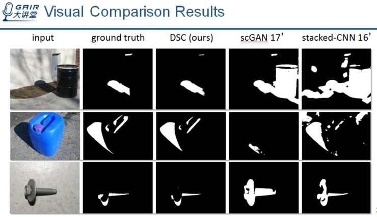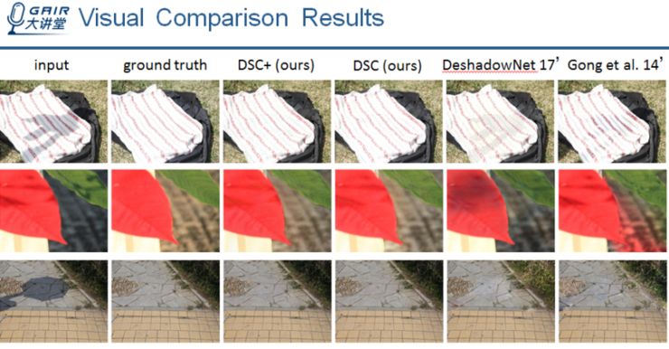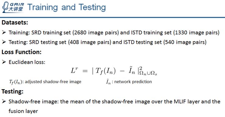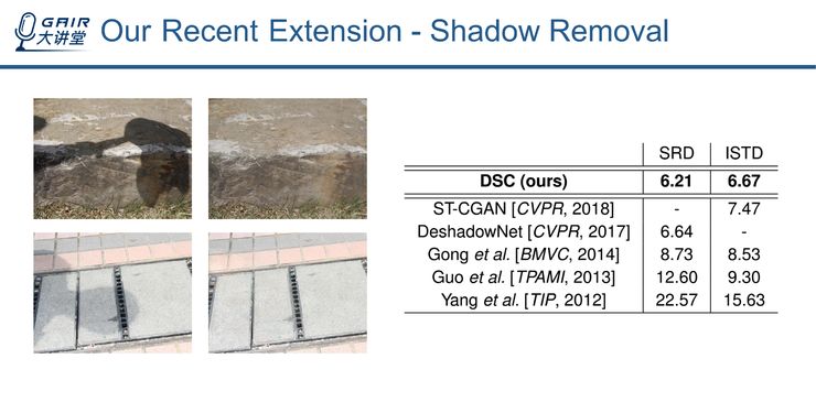 近期我们将网络用于阴影去除,在两个阴影去除数据集上取得了最好的效果。