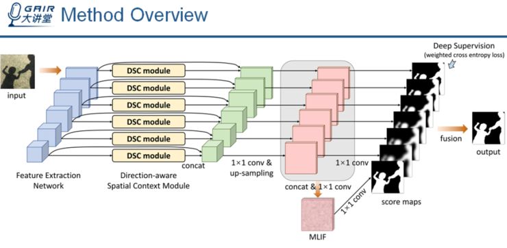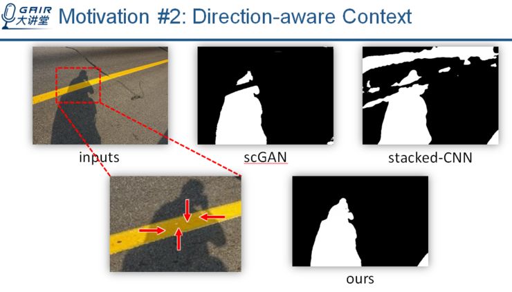 如果我们使用之前的方法,位于黄色区域的阴影可能会检测不到。但是,当我们方向性地分析图像上下文信息,就可以从图像的上面或者下面来传播阴影信息,同时可以使用左边或右边的信息来推断阴影区域。