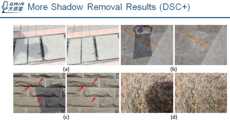 我们的方法可以去除在不同背景上的阴影区域 (如图 AB),也可以去除如图 C 中墙砖上不规则形状的阴影,以及图 D 中复杂背景下的阴影。
