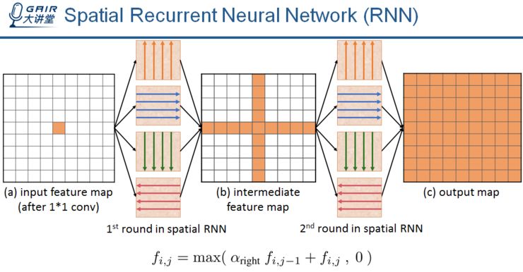 在这个更新的过程中,信息在整张特征图上从左到右传播(公式中的权值 alpha right 是共享的并且可以自动学习的)。通过聚合四个方向的结果,对于每一个像素点来讲,就可以获得它所在的行和列的信息。