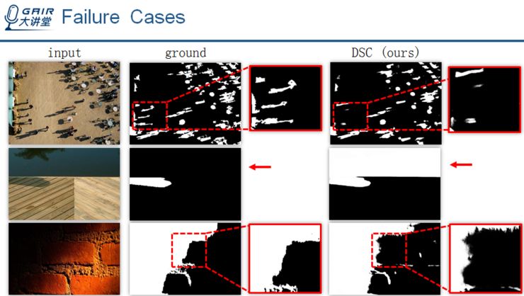 可以看到,我们的方法能够有效的识别出黑色的物体,同时检测到位于不同颜色的背景上面的阴影,相比之下,其他方法可能会失败。