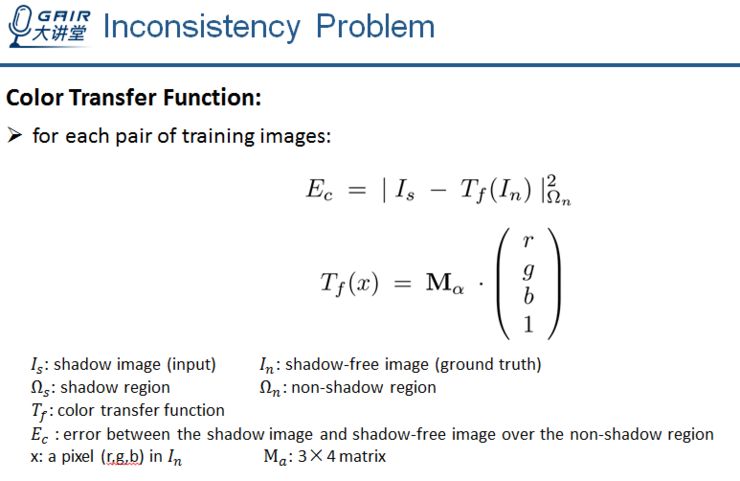 实际上每张训练样本都有一个转换函数,由于每张拍摄样本的偏差可能都不一样(每张样本都有各自的颜色转换函数),所以我们将学到的颜色转换函数应用到原始的 ground truth 上,就可以得到与输入图像非阴影区域的颜色亮度相匹配的结果。