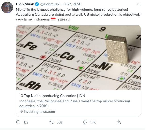 马斯克凌晨发推表示“镍是锂电池续航的最大挑战”