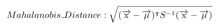 还有一种距离也蛮常见,叫做马氏距离,它是衡量一个点到一个分布之间的距离,或者说偏离程度。给定分布的均值μ和协方差S,从点x到该分布的马氏距离的计算公式如下: