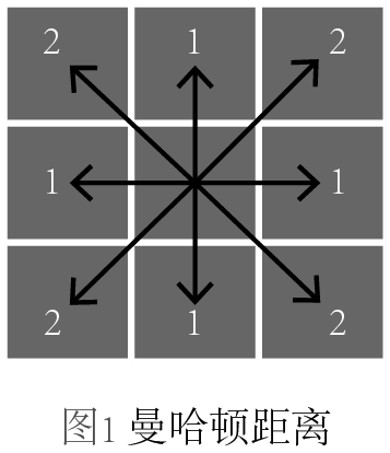 图1,曼哈顿距离,它是所有坐标轴差值的求和,可以想象一个城市的街道是完全网格状的,那么你从一个地方走到另一个地方就必须得走成曼哈顿距离的形状。