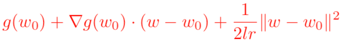 需要注意的是,泰勒公式是一个近似表达式,若w距离w0越近,则近似效果越准确;反过来,若w偏离w0较大,那么近似效果就会比较差。因此,我们在用上式来代表g(w)的时候,应该遵守一个约束条件,这个约束是w距离w0的距离要足够小。我们可以用距离公式,表示距离的公式有很多,使用最常见的欧几里得距离公式,并且为了接下来求导方便,加上一个系数1/(2*lr)在前面,于是寻找g(w)的最小值就变成了对下面表达式求关于w的梯度: