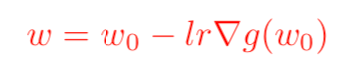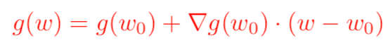 我们知道,对于一个足够光滑的函数,大一时候学过的泰勒展开公式告诉我们,在已知该函数在某一点的各阶导数值的情况之下,可以用这些导数值做系数构建一个多项式来近似函数在这一点的邻域中的值。于是,对于一个损失函数函数g(w),我们现在知道它在w0处的函数值以及各阶导数值,如何从w0出发来找到g(w)的极小值呢?我们可以对g(w)在w0点处展开,只保留到一阶导数,得到如下公式(其中▽表示梯度):