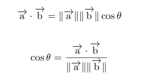 除了明氏距离之外,我们在自然语言处理中还用过余弦距离,通常余弦距离是用来判断两个元素的相似度(例如文档或段落),我们可以通过如下公式来得到余弦距离的计算: