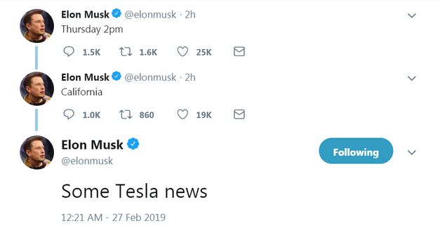 2月27日下午消息,特斯拉CEO埃隆·马斯克发布多条推文称,加利福尼亚时间周四下午2点(北京时间周五早上6点)将会公布一些特斯拉的新闻。